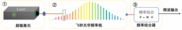 超穩(wěn)光生微波源主要由超穩(wěn)激光器、飛秒光學頻率梳和微波頻率綜合器這三部分組成,如圖 5所示。超穩(wěn)激光器提供超級穩(wěn)定的單頻激光信號,它是超穩(wěn)微波的參考源,它的頻率穩(wěn)定度制約著所產(chǎn)生的微波的頻率穩(wěn)定度。飛秒光學頻率梳用來搭建一條連接超穩(wěn)激光信號和超穩(wěn)微波信號的橋梁,讓超穩(wěn)激光直接將頻率穩(wěn)定度傳承給超穩(wěn)微波,得到光生微波信號。微波頻率綜合器,可以將飛秒光梳傳遞的微波信號變換至任意希望的頻率值上。