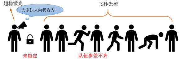 如果把超穩(wěn)光生微波源比作排隊走的隊列,那么超穩(wěn)激光就像隊列里面的帶隊人,隊伍的步伐大小、整齊度、每位隊員的相對位置都由這個領(lǐng)隊決定。飛秒光梳就像隊列里面的隊員,在沒有和超穩(wěn)激光建立聯(lián)系之前,光梳是自由運轉(zhuǎn)的,就如圖 6中所示的一樣混亂。而當通過一系列復雜的操作和領(lǐng)隊建立聯(lián)系后,就能使得每位隊員的步伐大小、步速、以及和其他隊員的相對位置都和領(lǐng)隊高度同步,如同圖 7所示,這樣就產(chǎn)生的超穩(wěn)光生微波信號。