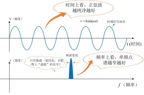 從時間尺度上看,超穩(wěn)微波信號是指周期連續(xù)、頻率單一的正弦波;而從頻率尺度上看,超穩(wěn)微波信號是頻譜寬度很窄的信號。如圖2。時間上信號的波形越逼近正弦波,頻率成分就越單一、穩(wěn)定度就越穩(wěn)定,頻域上信號的譜線寬度越窄,相位噪聲就越低。