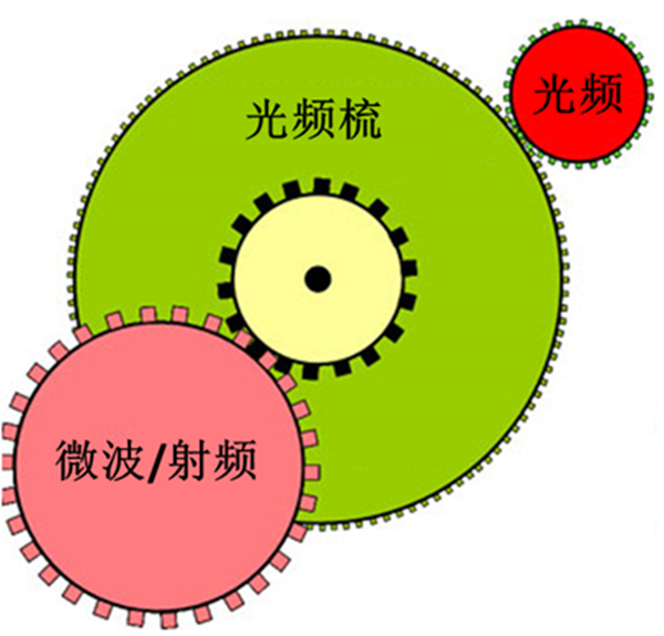 雖然激光的頻率很穩(wěn)定,但是激光的頻率卻很高,和微波頻率相比,一般要差5、6個數(shù)量級。因此無法直接對激光進行分頻而抑制了光生微波技術(shù)的發(fā)展。而在2000年, Theodor W. H?nsch教授和John L. Hall教授發(fā)明了光學頻率梳[3][4],就像一個齒輪組(如圖 9),既可以嚙合激光頻率,又可以連接微波頻率,可以直接對超穩(wěn)激光進行分頻至微波頻率,這項技術(shù)的發(fā)明使得光生微波成為可能。這兩位科學家也因為發(fā)明光梳而分享了2005年諾貝爾物理學獎。